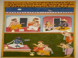 | Description / विवरण | Miniature painting based on Sarangadhar depicting Balmiki and Vedvyas being praised for their works- Ramayana and Mahabharat and some sages depicted worshipping them. Lord Vishnu is also depicted. |