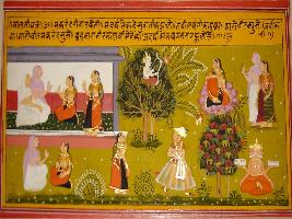 | Description / विवरण | Miniature painting based on Sanskrit-drama Malti Madhav depicting Lawangika asking Madayantika who has stolen her heart then she replied that Makarand, whom she saw as inteligent like Brahma has stolen her heart. |