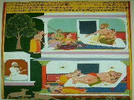 | Description / विवरण | Miniature painting based on Kalila Damana depicting a king seated with his wife and enjoying music and songs at the top of the painting, below it on the right hand side, a Fakir seated and raised fingers. On its left a Mithuna couple is seen. Painting having Mughal influence. |