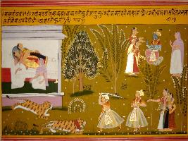 | Description / विवरण | Miniature painting based on Sanskrit-drama Malti Madhav depicting Madayantika saying that she knows that Makarand killed a tiger and Malti has given her heart to Madhav. |