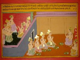 | Description / विवरण | Miniature painting based on Prithviraj Raso depicting Prithviraj s court scene on the right side of the painting and on the left and side he depicts with his courtesans, all of them are shown eating food. |