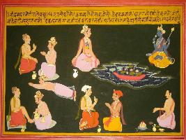 | Description / विवरण | Miniature painting based on Shri Bhagwat Gita. It depicts Krishna preaching Arjun that he who perform yagna will get Brahma and Salvation, but he who do not perform yagna will not get any lok. He also says that divya yagna and yagna are not equal and what men do is watched by god. |