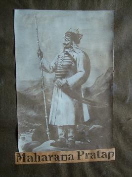 | Description / विवरण | It is a photograph of Maharana Pratap, who is in standing, posture. He wears a white tunic, shoes and turban. He is holding a Javelin and a sword in his left hand. It is mounted in a frame. |