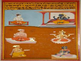 | Description / विवरण | Miniature painting based on Sarangadhar. In the top, Shiv and Vishnu are depicted, in the lower part Lakshmi is depicted holding flower and granth and sitting on lotus. Two men and a female deity are depicted in the lower part. |