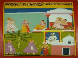 | Description / विवरण | Miniature painting based on Kalila Damana, on the upper part a couple is depicted making love with two women and a man. On the lower part a sage is depicted with 2 men and one women. Mughal influence can be seen. |
