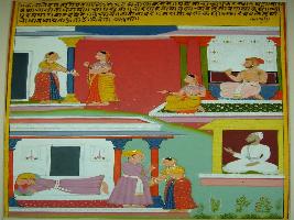 | Description / विवरण | Miniature painting based on Kalila damana, on the upper part a man is depicted with a woman and a woman standing in front of a woman tied. On the lower part a sage is depicted sitting one man is sleeping one man opening knot of the woman tied. Mughal influence can be seen. |