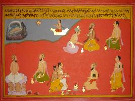 | Description / विवरण | Miniature painting based on Shri Bhagwat Gita. It depicts Sages is like a Brahma. They should be fully satisfied when they come to home. Donor involve in sexual relation with their daughter. Sages took pain and arrives and departs according to their wishes. They never mourn, while performing yagna, one should give something in holy fire for Brahma. |