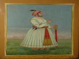 | Description / विवरण | Full length portrait of Maharana Pratap Singh II ruled, from 1751 to 1745, in standing position facing left. He is holding a sword in his left hand and a flower in his right hand. He is wearing a turban and well dressed and adorned with jewels. |
