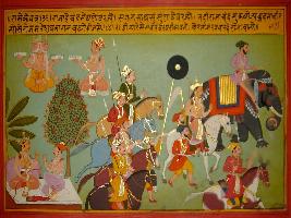 | Description / विवरण | Miniature painting based on Prithviraj Raso depicting Brahma in the upper right side while in the lower side the Jaichand is talking to Chandvardai and gives him lots of wealth. In the left side the marching of the Jaichand is depicted. |
