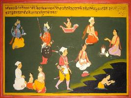 | Description / विवरण | Miniature painting based on Shri Bhagwat Gita. It depicts Krishna preaching Arjun that one cannot get what he wishes if he does his Karma with a wish. It was like king and Brahman is taking a pledge. He asked him to do his karma. |