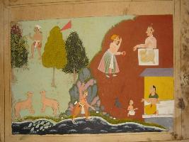 | Description / विवरण | An incomplete miniature painting of a hunter and a king. The painting depicts a story of a king that related to jungle. On the painting a hunter, a king and mother and child is depicted. |