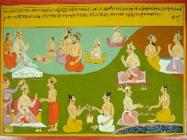 | Description / विवरण | Miniature painting based on Mahabharat - Rajdharma parva. On the painting Vyas is asking Yudhisthir and then Narad came. Vyas says to perform yagna as well as maintaining the Raja Dharma and than a king achieved place at heaven. |