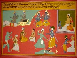 | Description / विवरण | Miniature painting based on Shri Bhagwat Gita. It depicts Krishna preaching Arjun about reason of him and Arjun taking birth. Whenever there is destruction of Dharma, he took birth an earth, Kills bad man and restore Dharma. |