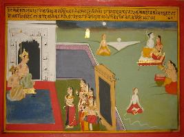 | Description / विवरण | Miniature painting based on Prithviraj Raso. king is depicted here sitting in the palace and some men and women depicted performing before him and their instruments sound as if Kamdev is blowing conch. |