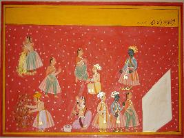 | Description / विवरण | Miniature painting based on Sanskrit drama Malti Madhav depicting two female embracing each other and Madhav looking to Malti from distance. One female is depicted working with pestle and muller and below right corner a man is plucking flower. |