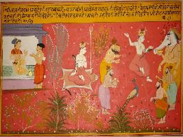| Description / विवरण | Miniature painting based on Sanskrit drama Malti Madhav depicting Mahadev from whose bun Ganga flows and from whose third eye lightening occures.It also depict Shiv ganas playing music. |
