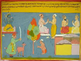 | Description / विवरण | Miniature painting based on Mahabharat - Rajdharma parva. Where Vyas says that to Yudhisthir to do his duty because everything is done by according to the wish of god. If anybody do any sins than king is not responsible for that. The painting depicts above mentioned story as told by Vyas. |
