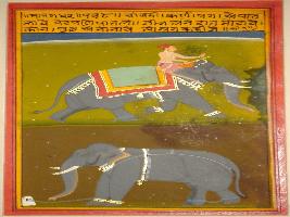 | Description / विवरण | Miniature painting based on Sarangadhar depicting the beauty of elephants. At the lower part, an elephant is depicted with strings of bells tied on his foreleg, on his neck and around the waist. He is shown tied from chain. At the upper panel, he is shown walking with a rider. |