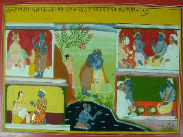 | Description / विवरण | Miniature painting based on Mahabharat - Adi parva depicting Arjun reaches Dwarika after his pilgrimage and meet Krishna. |