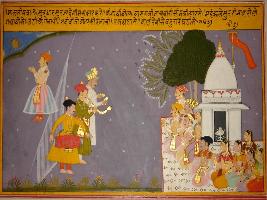 | Description / विवरण | Miniature painting based on Sanskrit drama Malti Madhav depicting sutradhara after worshipping the sun start the drama and other natas preparing their musical instruments. |