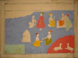 | Description / विवरण | Miniature painting depicting probably Kalila Damana. They are shown sitting at lower left part. At the lower middle part, two men are shown sitting with one of them giving something to other. At the upper left part, king is shown sitting with another man. One man is shown whispering in king s ear. At the upper middle part, man is shown hand tied with him, another man is shown standing. It is an incomplete painting. |