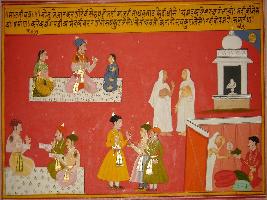 | Description / विवरण | Miniature painting based on Sanskrit drama Malti Madhav depicting a noble who is talking with a little boy backed by a female attendant. below it three men are talking about the performing of Malti Madhav drama while Kamandaki is seen in the green room beside it a Shiv temple also can be seen in the upper left side of the painting. |