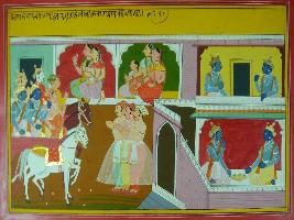 | Description / विवरण | Miniature painting based on Mahabharat - Adi parva depicting Arjun coming from Dwarika with Krishna. |