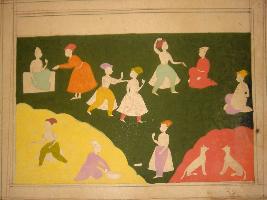 | Description / विवरण | An incomplete miniature painting of Kalila Damana. Where Kalila and Ravan is seen in the lower left corner and Kalila telling a story about a king and his people. On the other part of the painting depicts the said story. |