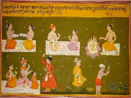 | Description / विवरण | Miniature painting based on Sanskrit drama Malti Madhav depicting sutradhara telling the genealogy of Bhaobhuti , the composer of the drama who is the son of Nilkantha. |