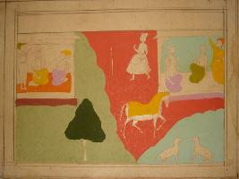 | Description / विवरण | An incomplete miniature painting based on Kalila Damana probably depicting two jackals at the lower left corner talking to each other. on the upper left four persons engaged in a meeting and one of them come to the king and describing depicted at the upper right corner . A horse is seen at the centre. |
