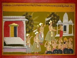 | Description / विवरण | Miniature painting based on Prithviraj Raso. Raja Jaichand is visiting a temple early in the morning. |