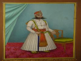 | Description / विवरण | Full length portrait of Maharana Swarup Singh in standing position, facing front holding a sword in his right hand while his left hand rests on a chair. He is wearing a elaborate turban. He has bearded face, well dressed and adorned with jewels. |