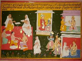 | Description / विवरण | Miniature painting based on Sanskrit drama Malti Madhav depicting Kamandaki telling Avalokita that Malti is the daughter of Bhuri Vasu and Madhav is the son of Devrat and gods asking Kamandaki to arrange their marriage. |