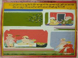 | Description / विवरण | Miniature painting based on Mullah-do-Piyaja depicting Mullah-do-Piyaja telling Akbar that servants are looking at the king who is having a watermelon. |