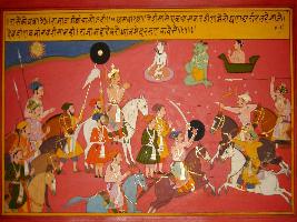 | Description / विवरण | Miniature painting based on Prithviraj Raso depicting attacking Jaichand probably moving with 1100 horses. Devtas and demons come to see them. The king saw Shiv in his meditation. |
