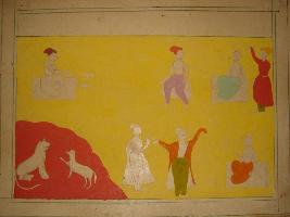 | Description / विवरण | Miniature painting depicting story of Kalila Damna. Kalila is shown talking to tiger at lower right part. Above this, a man is shown sitting with some vessel. At upper left, king is shown sitting with attendant and one man is shown leaving below this, king is shown sitting. To its right, a man shown wearing coat. It is an incomplete painting. |