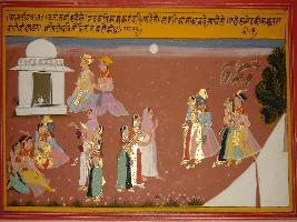 | Description / विवरण | Miniature painting based on Sanskrit drama Malti Madhav depicting Makarand and Madayantika, Madhav and Lawangika sitting together and Kamandaki, Malti and Avalokita showering water to them. |