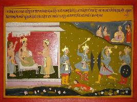 | Description / विवरण | Miniature painting based on Prithviraj Raso depicting a messenger telling king Jaichand that Prithviraj is sitting in the court in the way Indra sit in Indralok. Hearing this the heart of Jaichand blooms like a lotus. |