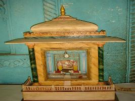 | Description / विवरण | Miniature model of a Shiv temple, made of wood, on a rectangular wooden pedestal. The body of the temple is also rectangular having four pillars in its four sides. The upper part is of dome shape. Inside the temple, two priests are worshipping Shiv and Parvati. Two cows and a miniature watch is seen at the door of the temple. |