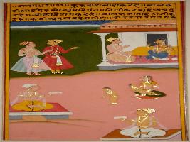 | Description / विवरण | Miniature painting based on Sarangadhar depicting a couple in the upper part, where the wife is informing her husband about their would be child. In the middle portion the family is seen. |
