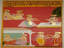 | Description / विवरण | Miniature painting based on Sarangadhar depicting four pairs of standing and seated men having conversation. |