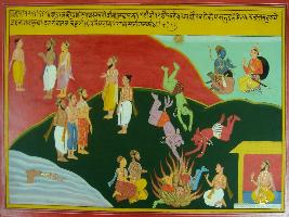 | Description / विवरण | Miniature painting based on Mahabharat - Adi parva. It depicts Vashishth and Parashar doing yagna, and demon come down in fire and they burnt. |