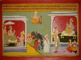 | Description / विवरण | Miniature painting based on Prithviraj Raso depicting Jaichand asking Samant to give Chandvardai 50000 gold coins, pearls, 50 elephants and other things in daan as king Vikramaditya gave many things to Betaal in daan. |