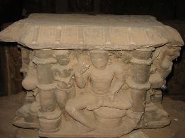 | Description / विवरण | A sculptured architectural fragment of lower part of pillar depicting a male deity flanked by one female attendant from right side, deity is seated in Lalitasana, on the left and right of deity, there are also carving for decoration, there is a depiction of vyala figure on left top. |
