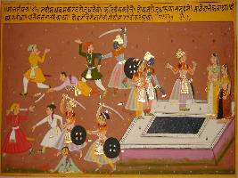 | Description / विवरण | Miniature painting based on Sanskrit drama Malti Madhav depicting Madhav and Makarand fighting with their enemies and Kalihans says that they killed many men near the sea shore. |