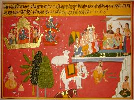 | Description / विवरण | Miniature painting based on Kashi khand where Shivsharma says to ganas about Indrapuri Kamdhenu, Airavat, Kalpddum as depicted at on the painting. |