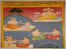 | Description / विवरण | Miniature painting based on Sarangadhar depicting philosophy of life that people believe and understand the talk of foolish people but not of a knowledgeable man. They are in bhram , one who has little knowledge. At the lower right, a man is sitting with a Brahman, who has no knowledge and taking advice. Above them, two learned Brahmans are sitting and discussing Shastra. |