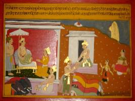 | Description / विवरण | Miniature painting based on Prithviraj Raso depicting Samant Pradhan telling Jaichand that he prepared 30 elephants that are as powerful as the elephant of Indra. He also prepared 200 horses and gold as much as Meru mountain. |