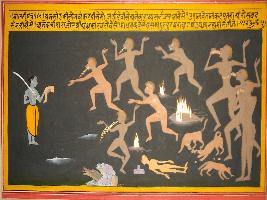 | Description / विवरण | Miniature painting based on Sanskrit drama Malti Madhav depicting Madhav, who is holding a sword and part of leg and devils are seen coming to eat the flesh. Writings at the top describes that Madhav descibing the story to himself. |