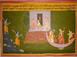 | Description / विवरण | Miniature painting based on Sanskrit drama Malti Madhav depicting Madhav at the extreme right running, holding a sword at the right hand and a piece of flesh at the left hand. Malti is seen dancing in front of the temple of Bhavani on a boat under which a tortoise is seen. |